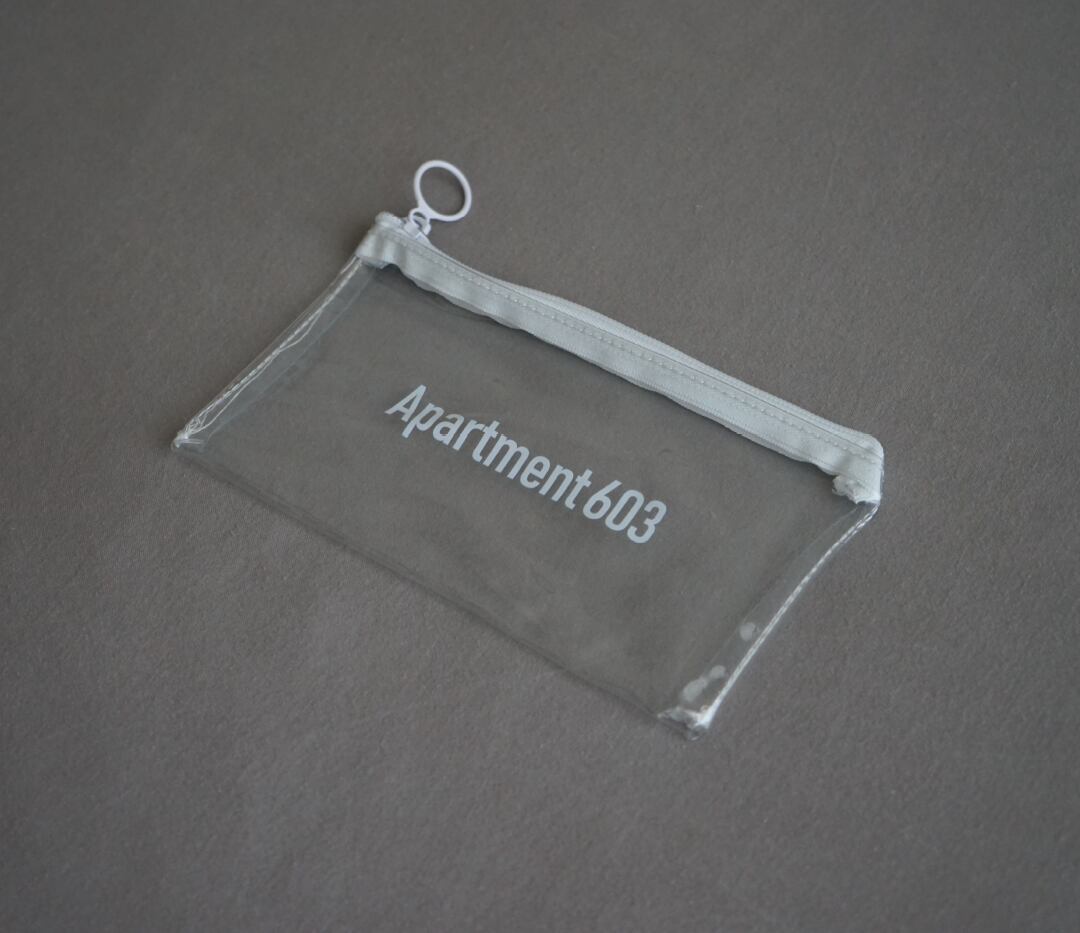Apartment603ロゴをプリントしたPVC素材のミニポーチ。 ペンケースやバッグ内の仕分けポーチとしてお使い頂けます。
